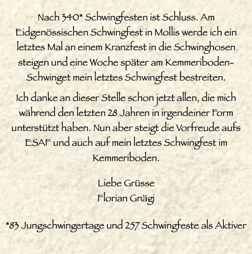 Leider muss ich krankheitsbedingt auf den Start am Hallenschwinget Büren verzichten. Ich hoffe, an den restlichen Feste gemäss meiner Planung teilnehmen zu können. Ich freue mich auf jeden Fall auf eine weitere Saison im Sägemehl!